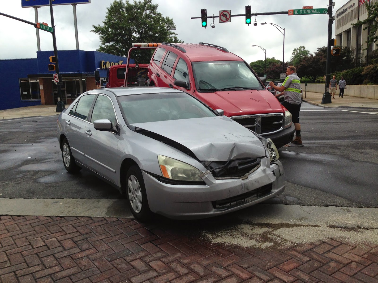 In short, the red light runner is a thing here, and on June 8th, I became a victim to one. I was coming back from Trader Joes and, as I went through an intersection, I saw another car coming into the middle from my left. It had been raining and I thought she was going to stop at her light (silly me). She did not, and I ran into her passenger side door.